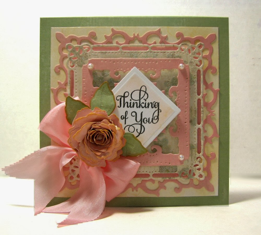 The first layer is the "Fleur de Lis" Square" and the second and third layers are "Marvelous Squares". The designer papers are The French Country Stack by Die Cut With A View. I stamped my sentiment from "Large Fancy Sentiment" by JustRite® Papercraft onto a "Classic Square" and turned it to be a diamond. Then sponge the sentiment with pink and peach ink. The rose was created with "Spiral Blossom One" and I sponged the edges with pink ink. The leaves were created with "Foliage" and then sponged the edges too. All the above dies are all by Spellbinders® PaperArts. My finishing touches are three white pearls and a silk ribbon bow from The Stamp Simply Ribbon Store.